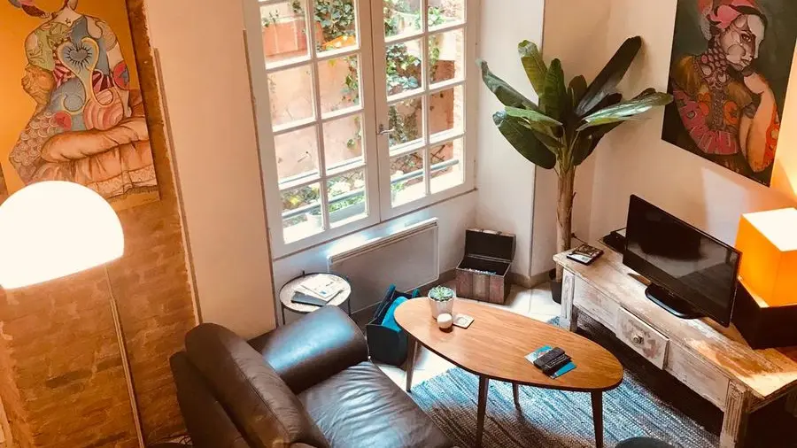 On the 1st floor, a living room with kitchen area (fitted LV units, LL microwave), a lounge area (sofa, TV) opening onto a covered terrace with garden furniture and seating. Shower room with wc. On the mezzanine, a bedroom (1 bed 140) with blackout curtains. Terrace overlooking courtyard with sofa, table and chairs. Accommodation not overlooked.