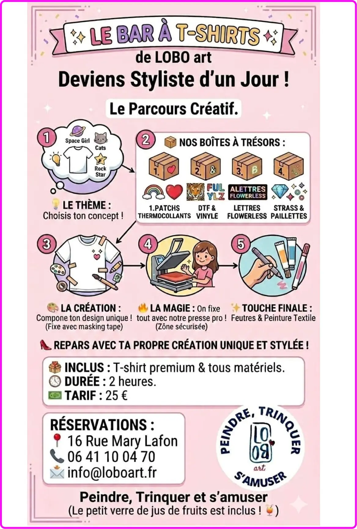 Creative support: All materials are provided (t-shirt, fabric paints, stencils, etc.).