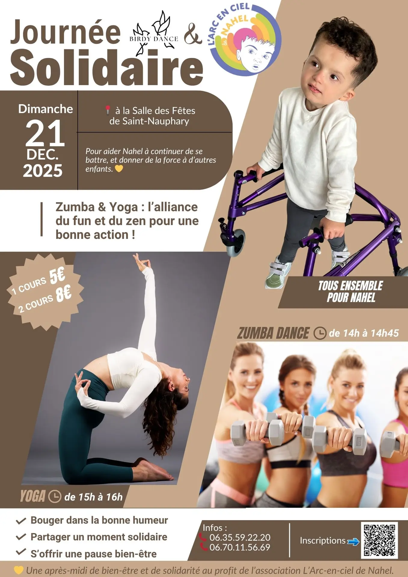 Zumba y yoga para apoyar a Nahel, un niño pequeño con trisomía 7p parcial, y ayudar a otros niños con discapacidades a prosperar.