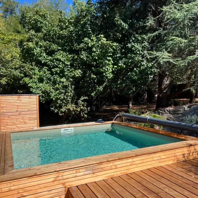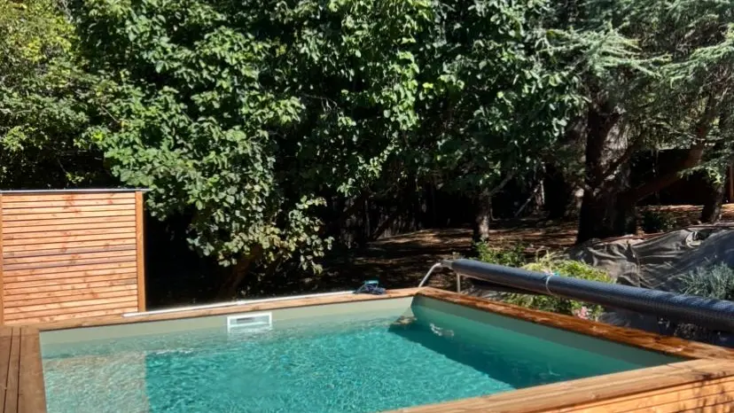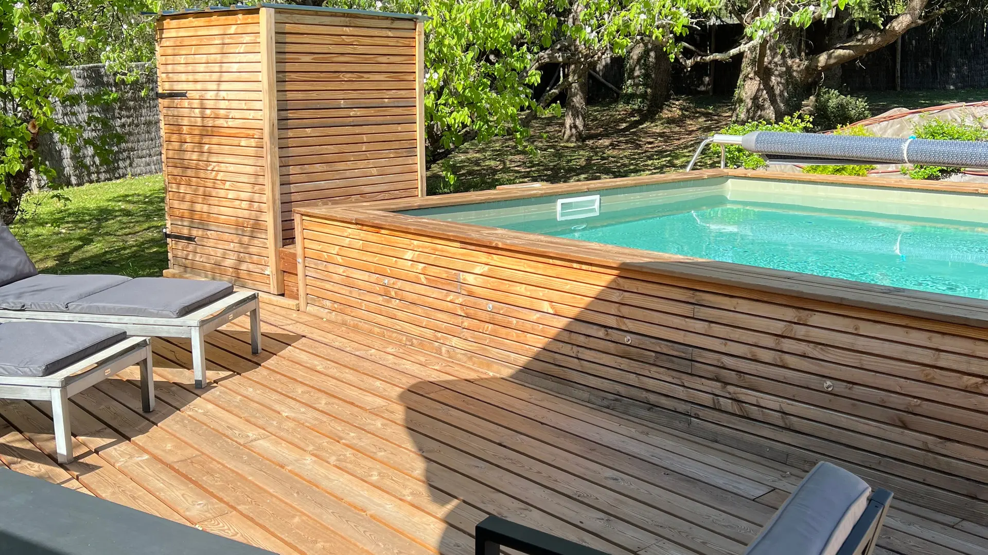 Terraza privada de madera (80m2) donde se encuentra la piscina privada cuadrada. Terraza delante del salón con muebles de jardín, barbacoa. Aparcamiento privado.