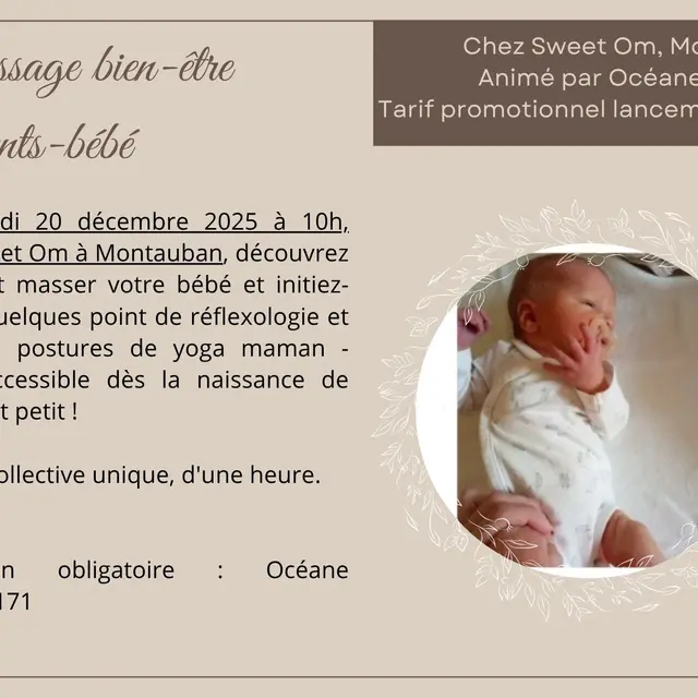 Comparte un momento de tranquilidad con tu bebé en este taller que combina masaje, reflexología y yoga para padres y bebés.