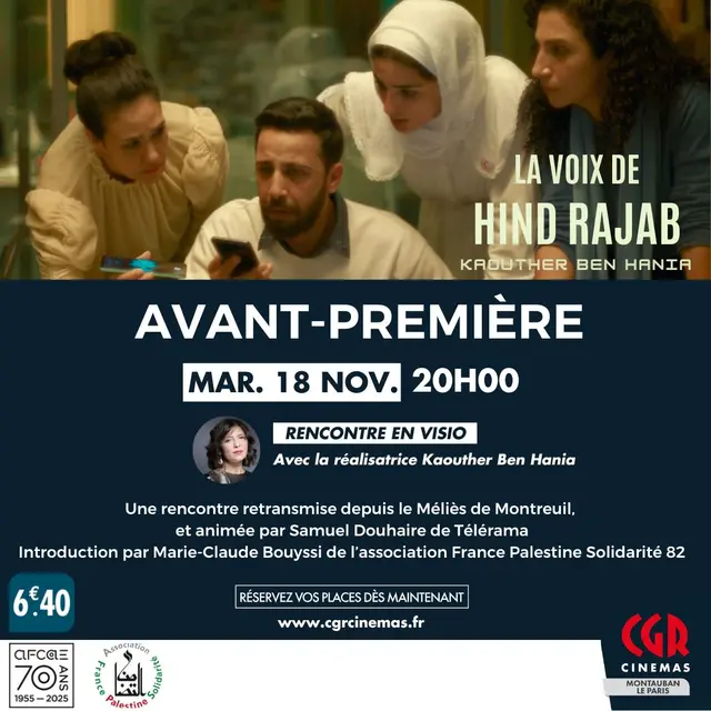 Proyección en colaboración con France Palestine Solidarité 82, seguida de una videollamada con la directora Kaouther Ben Hania, retransmitida desde Le Méliès en Montreuil.