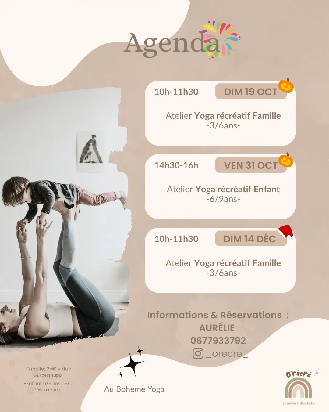 La sesión de 1,5 horas consta de 45 minutos de yoga divertido, seguidos de 45 minutos de talleres creativos.