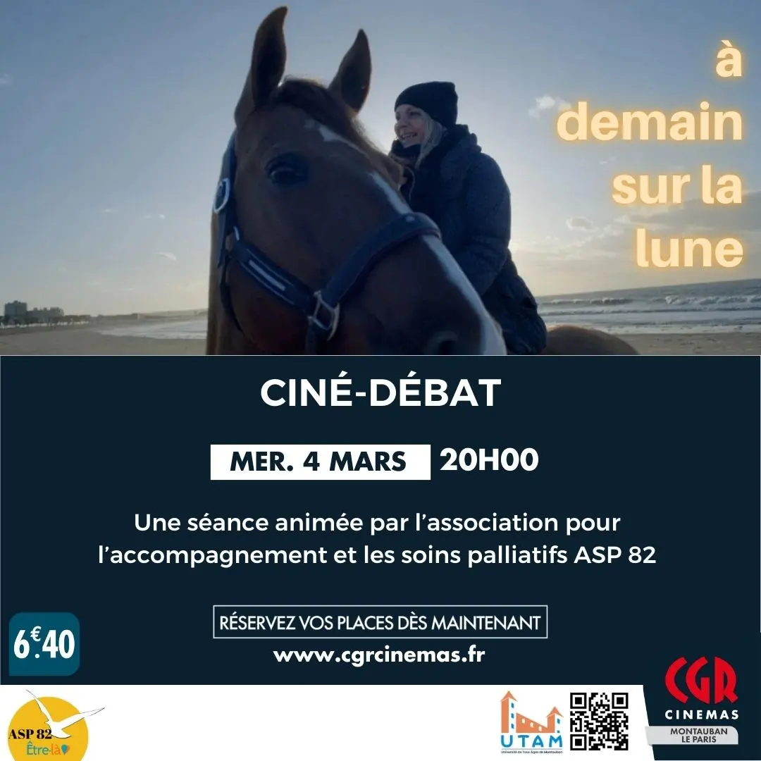 "Nos vemos mañana en la Luna" es un documental conmovedor y vitalista de resonancia universal que explora la experiencia del final de la vida en la unidad de cuidados paliativos del hospital de Calais, donde un caballo llamado Peyo visita a los pacientes más vulnerables para consolarlos en sus últimos días... Una proyección presentada y organizada por ASP 82 (Asociación para el Desarrollo de los Cuidados Paliativos).