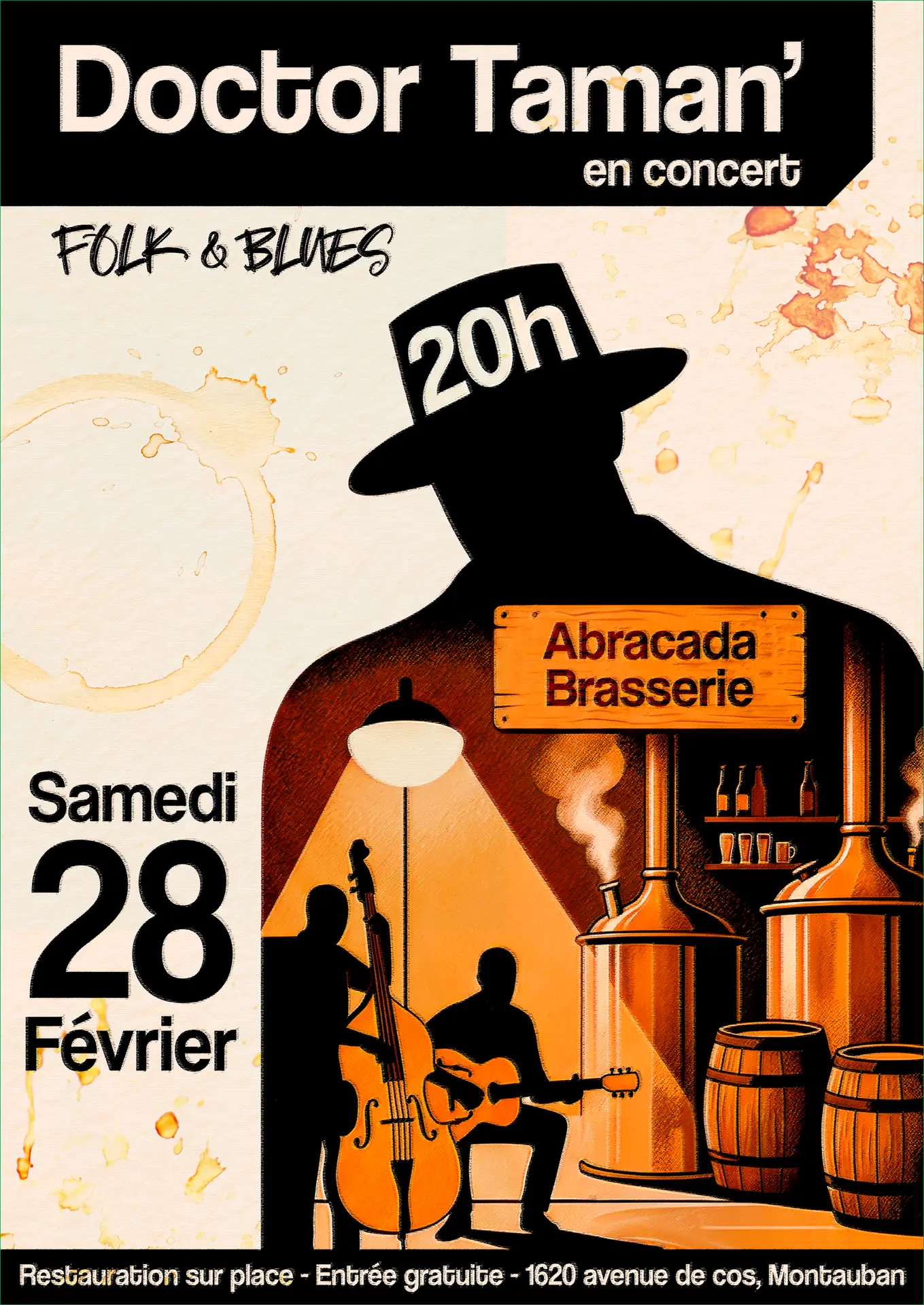 Abracada'Brasserie te invita a una noche de música de raíces con Doctor Taman', un dúo de folk y blues que te llevará del Delta Blues al folk acústico, con guitarra slide, contrabajo y voces conmovedoras.