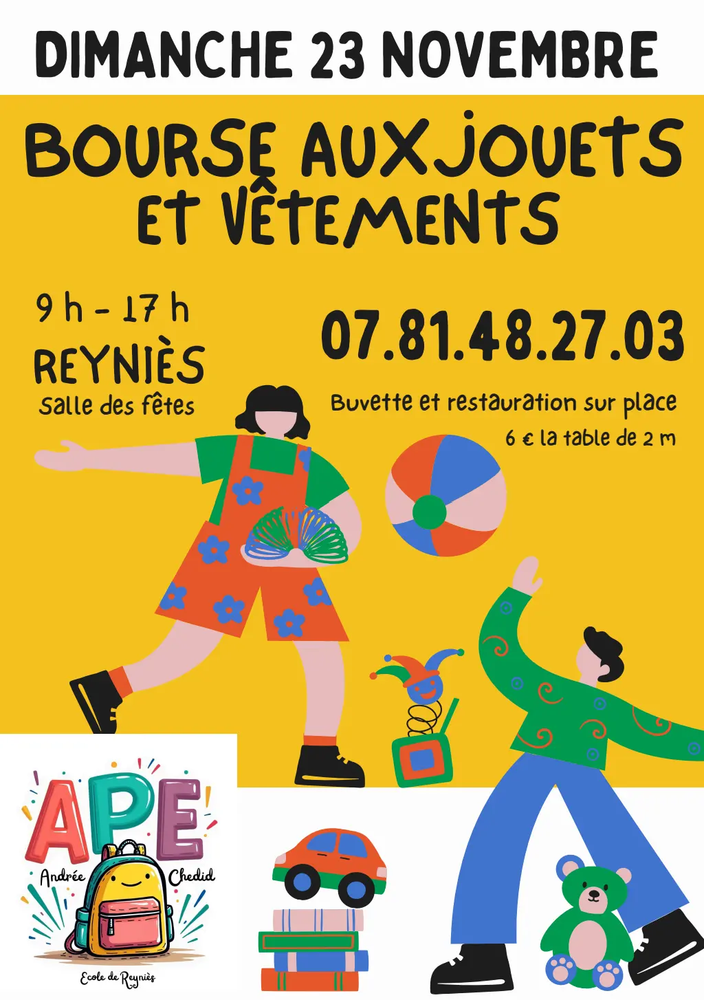 Bourse aux jouets et vêtements organisée par l'association des parents d'élèves de l'école de Reyniès.