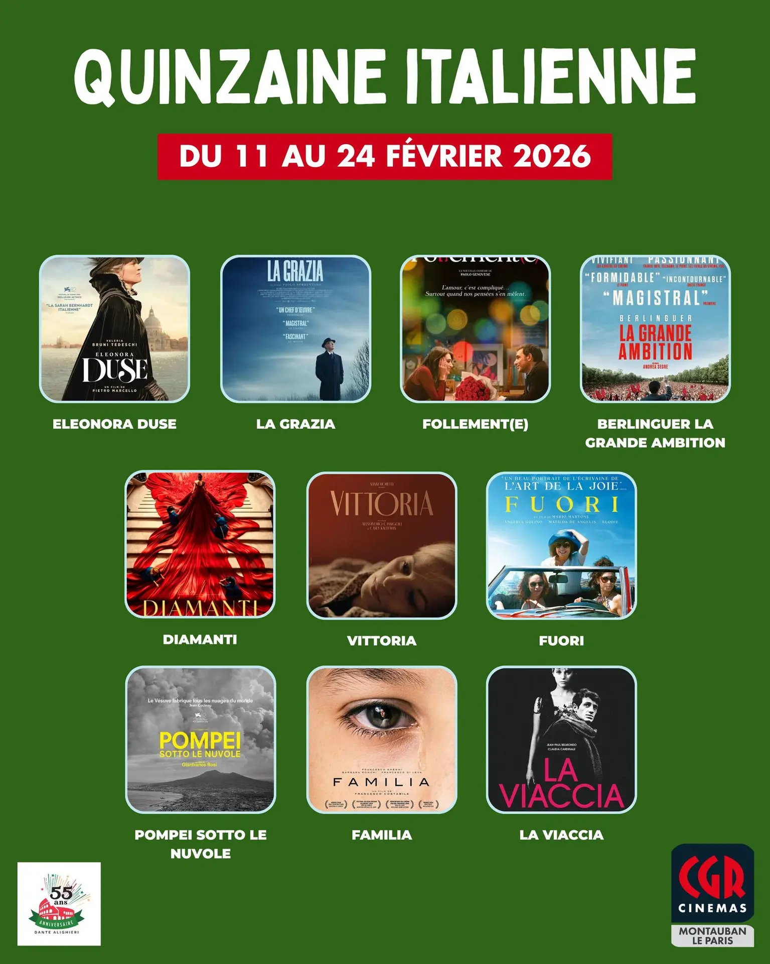 Comme chaque année, le CGR MONTAUBAN LE PARIS s'associe à la Dante Alighieri de Montauban pour vous proposer une sélection des meilleurs films italiens du moment, entre cinéma d’auteur, regards contemporains et hommage au patrimoine.