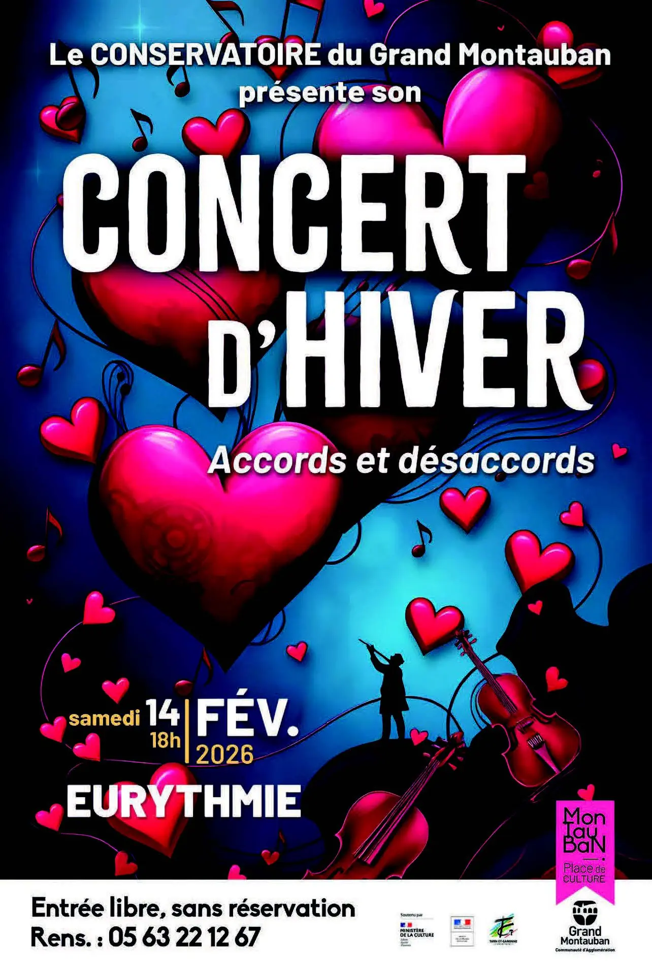 La salle Eurythmie accueillera le concert d’hiver des élèves du Conservatoire du Grand Montauban, samedi 14 février. Placée sous le signe des sentiments et de l’expression des émotions, la soirée « Accords et désaccords » rassemblera les ensembles à cordes accompagnés du chant lyrique, l’harmonie, l’atelier salsa et le groupe de percussions pour un programme riche et contrasté.