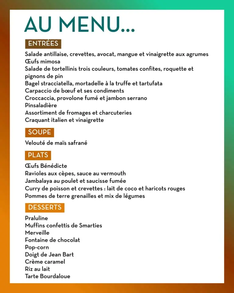 Côté cuisine : En entrée nous vous proposons des crevettes, salade antillaises, œufs mimosa, bagel stracciatella, mortadelle à la truffe, velouté de mais safrané....en plat des œufs Benedicte, ravioles aux cèpes, jambalaya et poulet.... et en dessert praluline, merveille, pop corn, crème caramel....