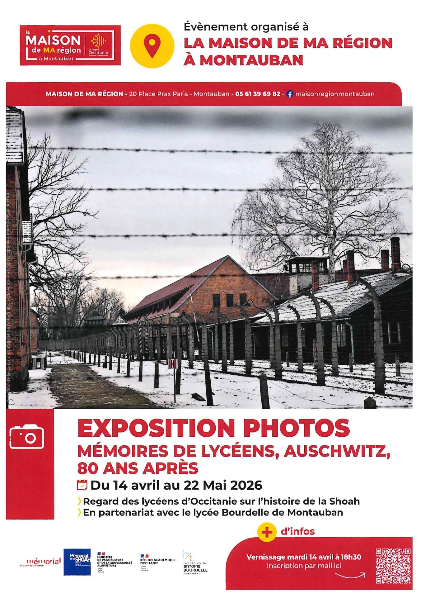 Venez découvrir le regard des lycéens d'Occitanie, dont celui des élèves du lycée Bourdelle de Montauban, sur l'histoire de la Shoah. À travers leurs photos et leurs témoignages, cette exposition retrace une année de travail marquée par le voyage d'étude sur le site d'Auschwitz-Birkenau. 80 ans après, ces jeunes nous livrent leur perception de ce lieu de mémoire universel, témoin de la barbarie.